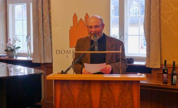 Zum Programm der Domwein-Präsentation gehörten Grußworte von Weihbischof Otto Georgens und Bürgermeisterin Monika Kabs. Der Weihbischof beschäftigte sich in launigen Worten mit dem Wein als Heilmittel, die Bürgermeisterin hob die Rolle der Stadt als Weinvertriebszentrum im Mittelalter hervor und äußerte sich dankbar dafür, dass mit der erfolgreichen jährliche Messe „Wein am Dom“ erneut eine enge Verbindung von Stadt und Dom mit dem Wein hergestellt worden sei.