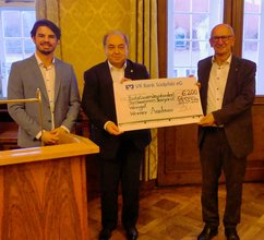 2 Euro für jede verkaufte Flasche Domwein fließen dem Dombauverein zu, der diesen Erlös für bauliche Maßnahmen zum Erhalt des Kaiserdoms zur Verfügung stellt. So konnten Vereinsvorsitzender Gottfried Jung und Schatzmeister Winfried Szkutnik vom Geschäftsführer des Winzervereins Deidesheim, Steven Kärgel und von Christian Anselmann aus dem Weingut Werner Anselmann für den Verkauf der Domwein-Edition 2023 Schecks in Höhe von 7 000 und 6 200 Euro entgegennehmen. So sind allein mit dem Verkauf von Domweinen seit der ersten Domwein-Edition im Jahr 1998 insgesamt über 190 000 Euro für den Speyerer Dom zusammengekommen.
